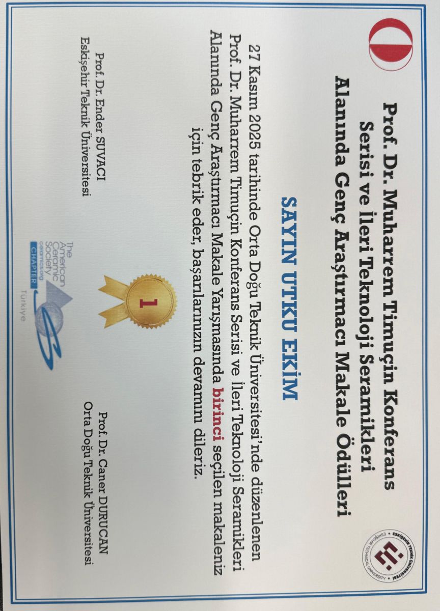 Amerikan Seramik Derneği (ACerS) Türkiye Şubesi, Orta Doğu Teknik Üniversitesi (ODTÜ) ve Eskişehir Teknik Üniversitesi tarafından 27 Kasım 2025 tarihinde Ankara’da düzenlenen Prof. Dr. Muharrem Timuçin Konferans Serisi ve İleri Teknoloji Seramikleri Alanında Genç Araştırmacı Makale Ödülleri etkinliğinde, Bölümümüz Araştırma Görevlisi Utku EKİM, birincilik ödülü almaya hak kazanmıştır.